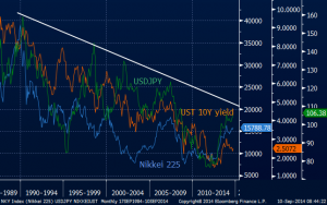 True, that correlations are not stable – and before the Lehman crisis, it was hovering around zero for many years. But the average historic correlation on daily changes has been positive, and in none of the 3-month period since 80s it has dropped to a larger negative value (0.5) than risen to a positive one (0.8). More importantly, the trend – the Nikkei 225, the USDJPY/EURJPY, the US government 10Y yield – has been shared over the past few decades. So, breaking any one of these is a “confirmation”, or reinforcement for the rest.