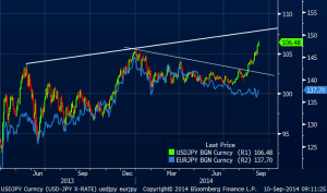 All this combined, the chances of the USDJPY rising toward 110 (our official forecast for end-2015) and EURJPY toward 140 sooner have increased now. If we have seen the action we have without the UST yields moving much up, it probably doesn’t take much of the upside move (and our forecast for next year is UST 10Y at 3.5%) to bring the USDJPY above 110 – even 120, if not 130 in 6M-1Y. Be ready for that. Notably, in the options market, calls for the upside move are still slightly cheaper than puts in the 6M-1Y segment. Any downside in the short term, toward 104-105 in USDJPY spot (not unlikely, after the recent impulsive spike) should be taken as an opportunity to position for upside in the 6M-1Y horizon. Currently, the EURJPY is a better risk/reward for the short haul, it is rather likely it can overshoot our long term forecast (140) soon.