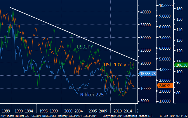 True, that correlations are not stable – and before the Lehman crisis, it was hovering around zero for many years. But the average historic correlation on daily changes has been positive, and in none of the 3-month period since 80s it has dropped to a larger negative value (0.5) than risen to a positive one (0.8). More importantly, the trend – the Nikkei 225, the USDJPY/EURJPY, the US government 10Y yield – has been shared over the past few decades. So, breaking any one of these is a “confirmation”, or reinforcement for the rest.