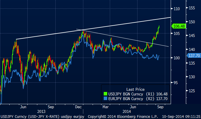 While the 2013 was the yen story – seen from positive high EURJPY and USDJPY correlation – this year, since June, it has been mainly a “strong USD” story, as the EURJPY and USDJPY have decoupled.
