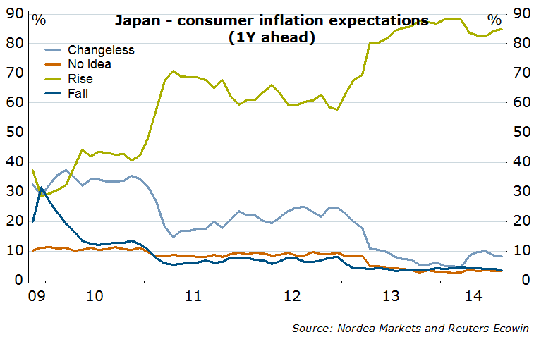 Abenomics have succeeded in some ways. In particular, inflation has risen as the labor market has tightened, with unemployment rate close to 20-year lows, the output gap has been almost closed, and the nominal wages are back growing at the rate fastest rate since 1997. Barring the data disappointments in Q2 and over summer, mostly due to the VAT tax hike in April, consumer confidence has recovered since, and inflation expectations are firmly on the upside.