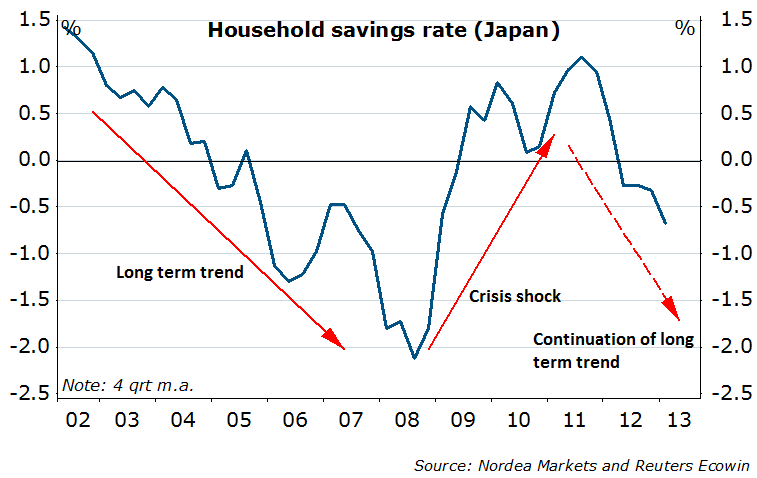 What if recovery resumes in Japan / real wages pick up – will rates rise and support JPY? It is clear that Japan cannot afford much higher rates – and it won’t have to. Divergent potential growth rates between the US, EMU and Japan, mostly due to demographics, will likely keep the interest rate spread in favor of the former, and that will also be in BoJ’s interest. Best case (and our base case), the BoJ will not have to ease more, but then – if that happens for good reasons – the Japanese stock market, trending down for years, and relatively cheap, will resume its rise, breaking the multi-year downtrend.