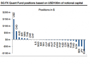 The most substantial change in terms of positioning this week has been the cut in the long AUD, NZD and NOK positions and the increase in the long CAD position. The SG FX Enhanced Risk Premia strategy continues to have a sizeable long dollar position that is currently complemented by a long CAD position.
