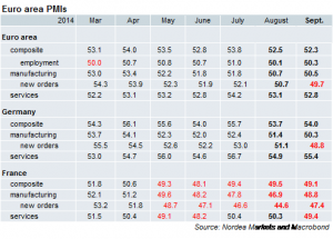 French data were mixed: up – but still well below 50 – in the manufacturing sector, and down to 49.4 in the service sector. No meaningful growth in sight in Q3.