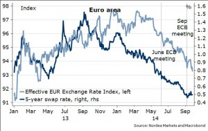 Draghi will probably also let his preference for a weaker EUR shine through. Moreover, we would find it logical and even necessary to tone down the importance of 5y5y inflation expectations for monetary policy. Movements in the – at times thin – inflation market do reflect more than changes in inflation expectations. Therefore, the 5y5y can only be one piece of information about medium term inflation expectations among others. Interestingly enough, Draghi referred to the 5y5y during his Jackson Hole speech in late August but did not so in Brussels last Monday.