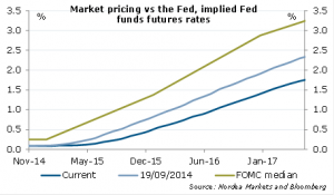 When the current programme (QE3) was launched in September 2012, the Fed said it would keep buying assets until there was a “substantial improvement” in the outlook for the labour market. As the unemployment rate has declined from 8.1% to 5.9% since then, we believe the Fed is ready to conclude that the criteria for substantial improvement have been met, as also Boston Fed President Rosengren said recently. As a matter of fact, the unemployment rate is now below the levels seen just prior to the start of QE1 back in late 2008 (see chart).