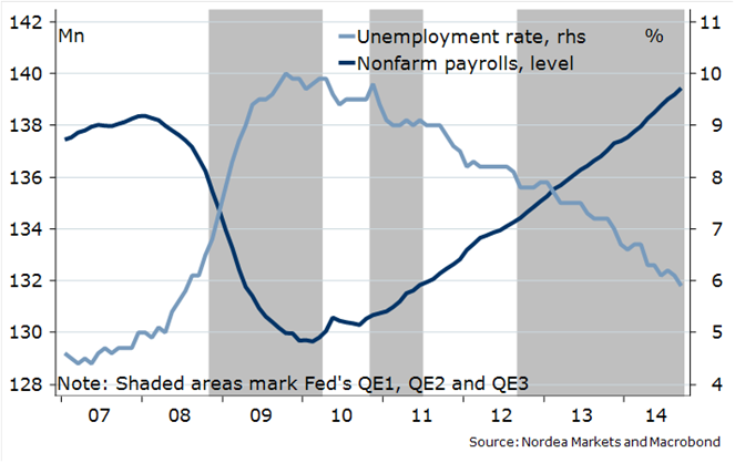 When the current programme (QE3) was launched in September 2012, the Fed said it would keep buying assets until there was a “substantial improvement” in the outlook for the labour market. As the unemployment rate has declined from 8.1% to 5.9% since then, we believe the Fed is ready to conclude that the criteria for substantial improvement have been met, as also Boston Fed President Rosengren said recently. As a matter of fact, the unemployment rate is now below the levels seen just prior to the start of QE1 back in late 2008 (see chart).