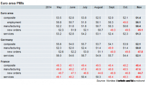 In line with consensus, we have been too optimistic in expecting that Euro-area PMIs will rise a bit in November. While the manufacturing PMI declined only a touch, the service component fell by a whole point. So the message is that 1) that weakness in manufacturing is far from over, 2) the weaker euro is not a big help so far, and 3) the service sector might not be immune.