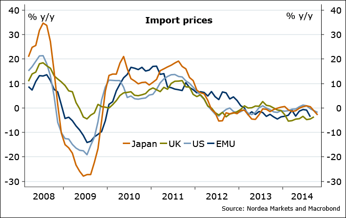 Firstly, inflation. The US is being dragged in global disinflationary trends (Figure 1). Market-based US inflation expectations have moved in lockstep with the USD this year – stronger USD, lower breakeven inflation rate. I haven’t seen Fed’s estimates of exchange rate impact on inflation recently, but ECB and BoE have provided theirs: 10% effective appreciation brings inflation down by 0.5%pt and 1%pt, respectively. The USD NEER is more than 4% up this year alone, should be at least 20bps downside effect on inflation. Huge? Not yet for Fed to worry, but just wait… (EMU inflation figures – this week’s highlight).