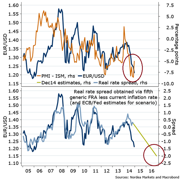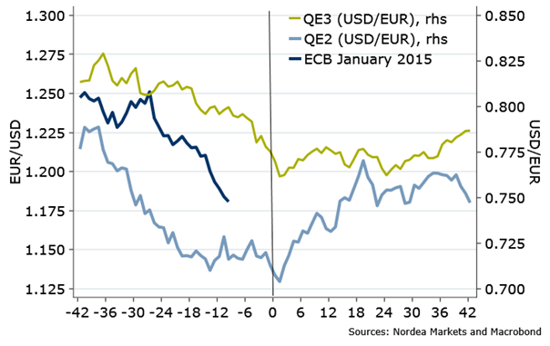 The 22 figure drop since the spring of 2014 does however warrant questions on how much is already in the price, especially in terms of ECB QE. Gauging by US experiences (chart 1), the currency whose central bank is about to launch a big QE program remains under pressure until the market obtains details of said program, after which the currency appreciates. Should the ECB launch a big-enough QE program – including details, at least on its size – in January, this could pave the way for weeks of EUR appreciation. In this scenario, the market will also need a new narrative to trade on. Should the ECB formally note its intent to launch a QE program, but delay in providing details, the market could keep chasing EUR/USD lower until the dust clears.