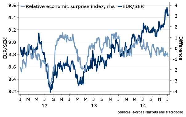 In the longer term, it is worth highlighting the relationship between the cross and relative activity (as proxied by PMI and ISM), as well as with relative real rates (chart 2). Relative activity suggests a rise in EUR/USD above 1.25 – owing to the drop in ISM and the stabilization of EMU PMI. This would make for a very interesting and contrarian forecast. However, the lessons from Sweden suggest “not so fast”. Since the Riksbank decided that inflation is what matters for monetary policy, activity has taken a back seat in affecting the exchange rate (chart 3). This should be the case for the Euro Area as well, at least until the ECB is much closer in getting inflation and inflation expectations back to target.