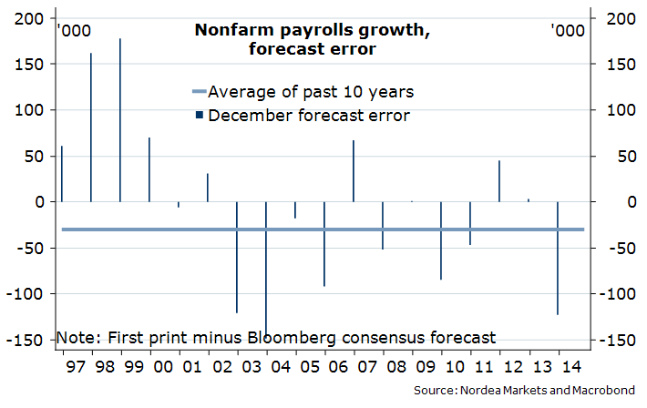 Today’s most important data release is the US employment report. We expect a 220k gain in payrolls in December, somewhat below the 240k consensus estimate. The unemployment rate looks likely to fall to 5.7%, while we forecast a muted 0.2% rise in average hourly earnings after November’s 0.4% increase.
