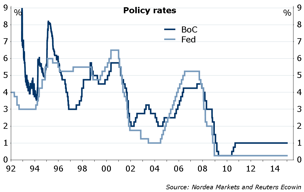 The Bank of Canada announced a surprise 25bp cut to its key interest rate Wednesday – a move it calls “insurance” against the potentially destructive effects of the oil price collapse. While the Fed and the BoC historically often have travelled in pair, we believe divergence will be the case this time. Cheaper crude oil, while good for the US economy, is unequivocally bad for Canada.